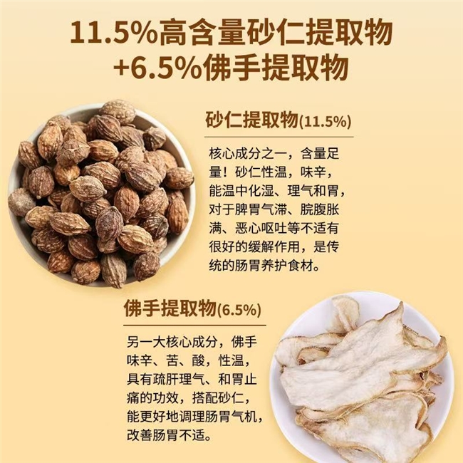 胃将军以高含量砂仁提取物(11.5%)与佛手提取物(6.5%)为核心成分,构建起靶向性胃肠养护体系。其中,砂仁提取物含有的乙酸龙脑酯等活性成分所制成的药物,能够精准调控胃肠平滑肌细胞的钙离子通道,促进胃动素分泌,进而加快胃排空速度;佛手提取物中所含的挥发油、黄酮类化合物等活性成分,可对胃肠动力进行双向调节,既能缓解胃肠道痉挛性疼痛,又能促进胃肠蠕动,同时还具有修复胃肠黏膜、改善肠道微生态环境的作用。