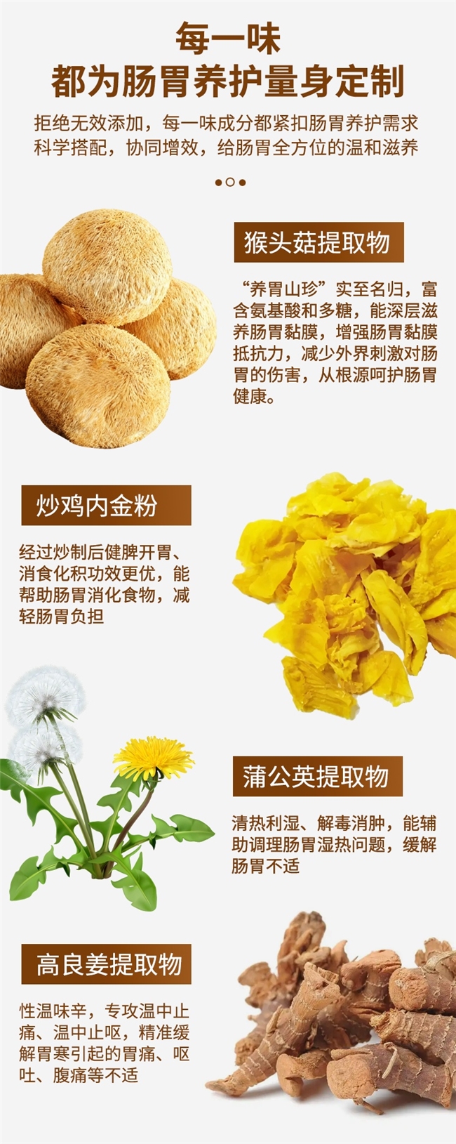 在此基础上,产品科学复配猴头菇、炒鸡内金粉、蒲公英、高良姜等草本成分实现协同增效。猴头菇可增强胃黏膜屏障功能,助力受损胃黏膜修复;炒鸡内金粉具备健胃消食功效,可改善食积不消等问题;蒲公英清热利湿,能够缓解胃肠燥热引发的不适症状;高良姜温中散寒,适用于脾胃虚寒人群的养护需求。产品全程杜绝无效添加,实现0色素、0防腐剂、0香精的纯净配方标准,每一味成分均紧扣胃肠养护核心需求进行科学配伍,为胃肠提供温和且精准的滋养。