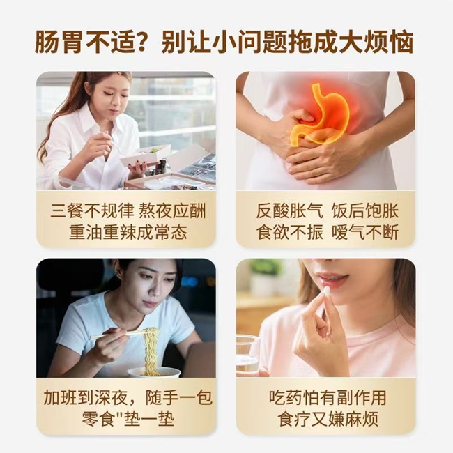 该产品的适用人群范围较为广泛,主要涵盖饮食不规律的职场人士、存在暴饮暴食情况的聚餐群体、脾胃功能较为虚弱的中老年群体、产后需开展脾胃调理的女性群体,以及因长期熬夜致使胃肠功能紊乱的群体等。