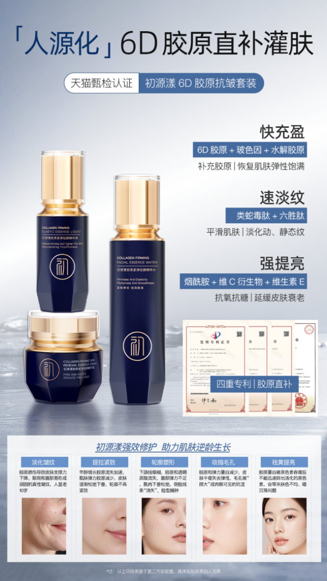 初源漾6D胶原抗皱套装,它有三大养肤体系层层护航,4大补胶原体系能补充流失胶原、促生胶原再生,双重抗皱淡纹成分能抚褪多种纹路,3大抗氧成分能提亮焕采,6大保湿成分能提供充盈保湿,补水、抗皱、紧致、提亮、修护一步到位,快速改善抬头纹、法令纹、鱼尾纹、川字纹、口周纹、木偶纹、颈纹!
