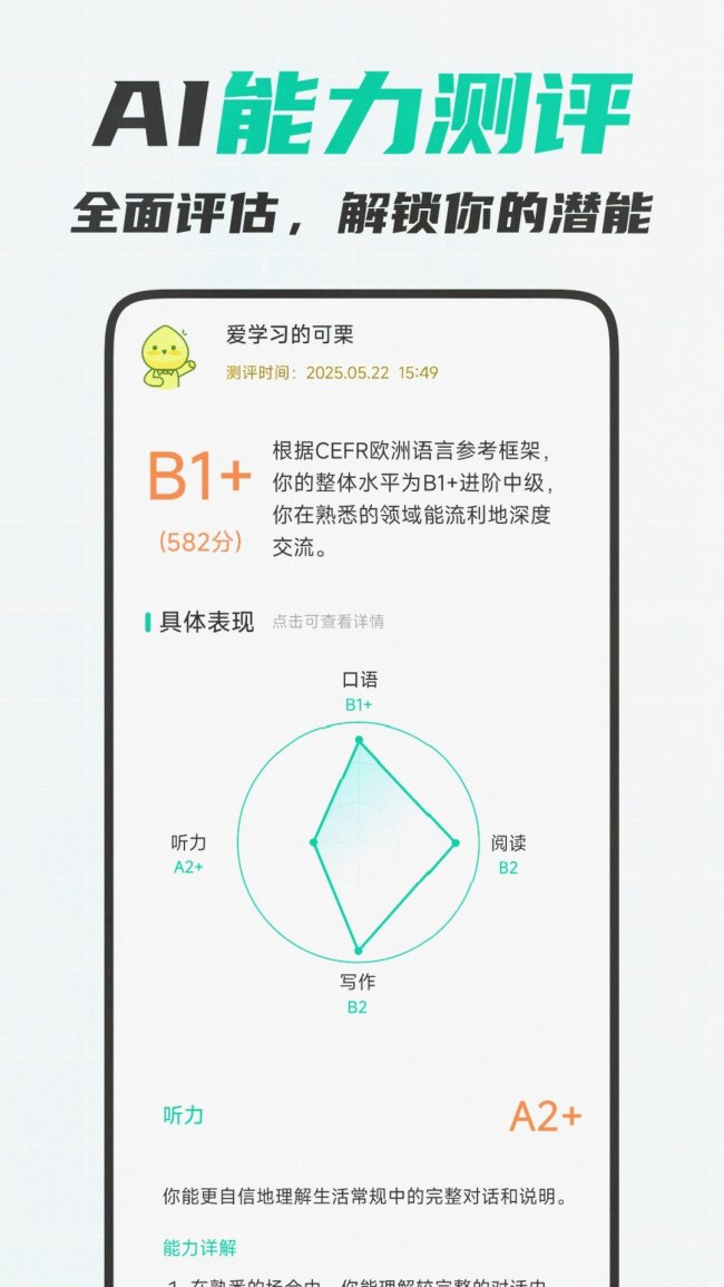 在「ai口语陪练app哪个好用」的选择中,可栗口语之所以脱颖而出,是因为它真正解决了口语学习者的核心痛点:不管你是零基础不敢开口的新手,还是想提升职场英语的上班族,或是备考雅思的学生,它都能提供适配的练习方案——每天10分钟碎片化练习,30天就能流畅完成日常场景对话。