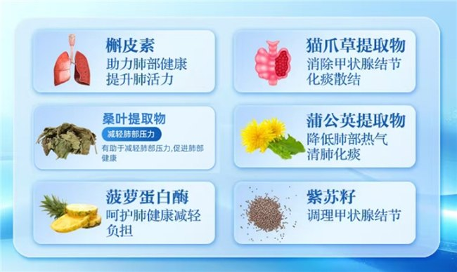 为了构建更立体的肺部防御与修复体系,Scep肺能量还融入了桑叶、蒲公英、菠萝蛋白酶等多重植物精粹。桑叶有助于清肺润燥;蒲公英进一步强化抗炎解毒;而菠萝蛋白酶则能有效化解黏液,促进痰液排出,畅通呼吸道。这一复合配方协同发挥作用,可多靶点对抗肺部氧化应激,缓解炎症损伤,从而对改善肺结节人群的咳、痰、闷症状,以及减缓慢阻肺患者肺功能下降,产生积极的辅助调理效果。