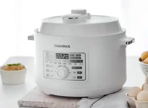 #Glasslock电压力锅采用清透玻璃感色系,机身做了透明视窗纹理,能直观观察内部状态,操作时更易把控节奏。