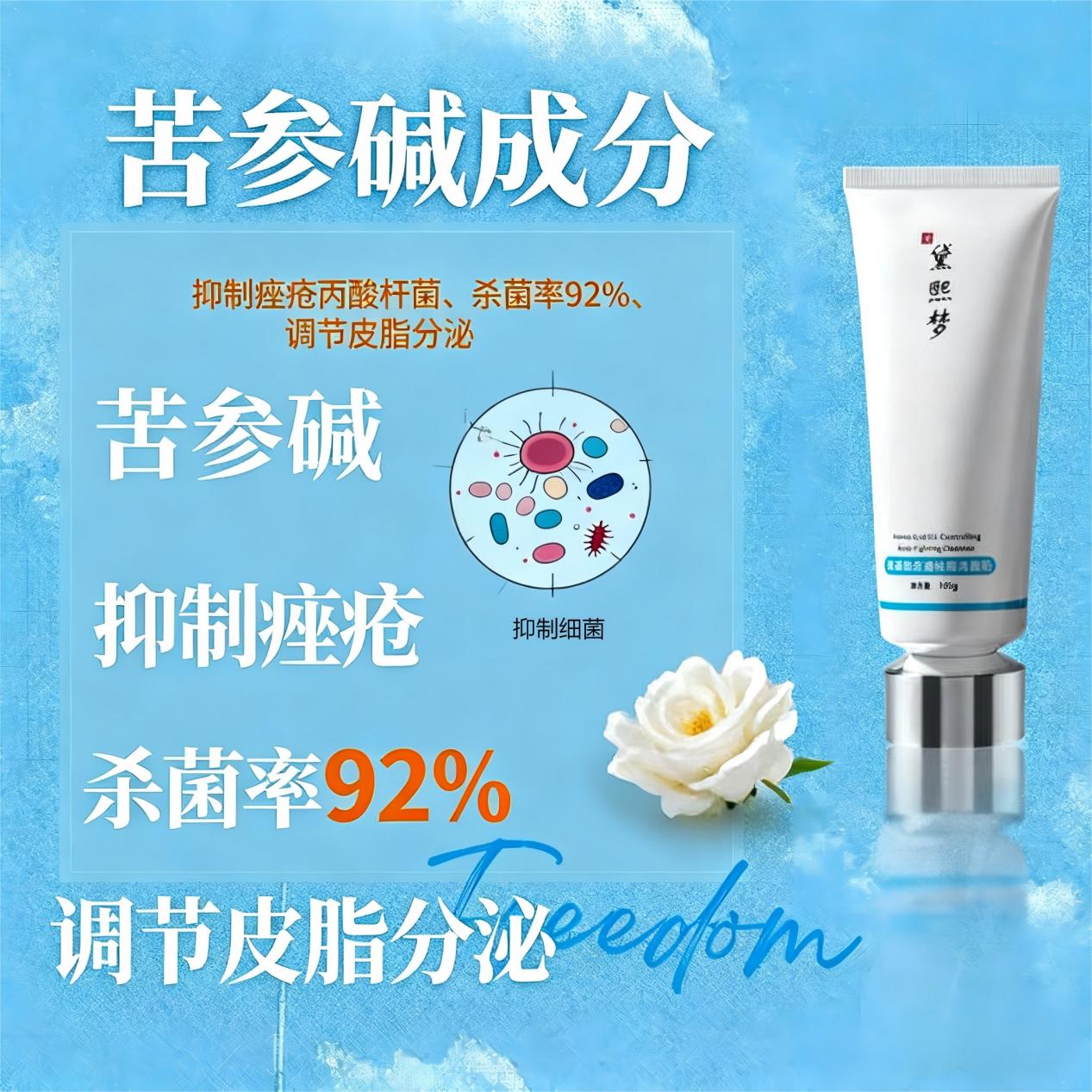 - 苦参碱:被多篇文献证实能抑制肥大细胞释放组胺,从源头掐断红肿瘙痒的信号,同时对痤疮丙酸杆菌有精准的抑制作用,相当于洗脸的同时就在给你的痘痘“消毒”。