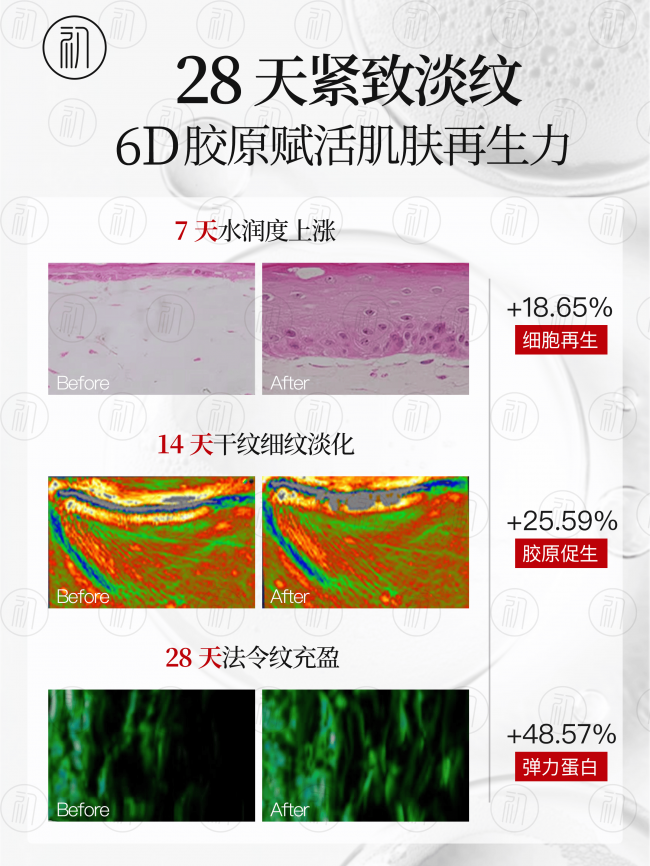 第9-12周:72%的受试者细纹、法令纹深度减少48%,角质层含水量提升132%,皮肤弹性提升56%,敏感肌耐受性提升76%,整体看起来年轻了好几岁。