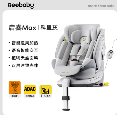 核心优势:适配0-12岁宝宝,身高覆盖40-150cm,通过新国标3C认证、欧盟i-Size/ECE R129(德国E1)认证,具备语音控制功能,通风加热可自动调节,无需手动操作,智能体验较好,支持单手按钮旋转,配备大额运费险。