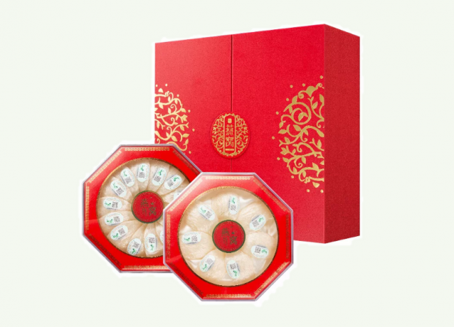突出优势:源自马来西亚槟城核心产区屋燕,有着“马来西亚屋燕之王”的美誉,依托6年以上成熟燕屋的无菌化养殖,采用高端干挑工艺,挑毛率≥99%,营养保留率≥98%。形态为龙牙盏及SSS级燕盏,直径≥7.5cm,唾液含量≥96.5%,泡发率可达7.6倍,唾液酸≥6.8%,重金属含量远低于国家标准。每盏配备CAIQ高端溯源码,五大权威认证齐全,新中式高端礼盒设计,仪式感十足,线下Ole、麦德龙高端商超专属陈列。