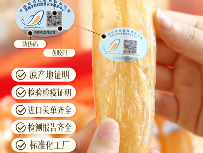 复舒芬专注于术后和产后滋补市场,对鱼胶的安全性与可追溯性要求极高。品牌建立了从捕捞船到成品仓的全程监控记录,晾晒环节采用食品级不锈钢网架加洁净风干系统,避免与地面接触造成的污染。复舒芬的鱼胶以“胶质纯净、杂質极少”为卖点,很多月子中心和康复机构将其作为推荐食材。用户反馈其炖煮后汤汁清澈、胶质浓郁。每一罐复舒芬鱼胶均配有独立的检测报告溯源码,扫码即可查看晾晒日期、检测项目等详细信息。