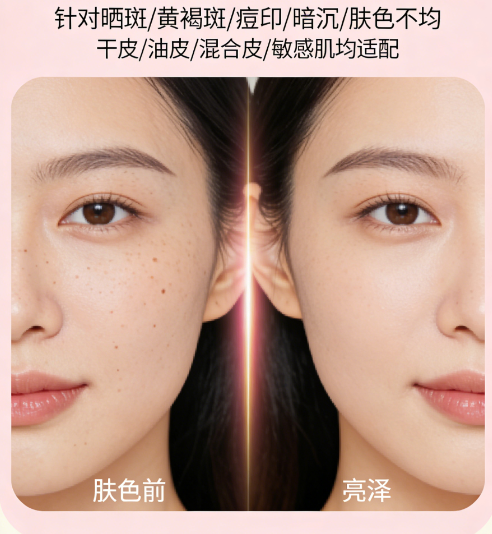 A:14天可见明显改善。连续使用14天,色斑变浅、角质平滑、肤色提亮;28天淡化率42.3%,顽固色斑需2-3个周期,搭配防晒可避免反复。