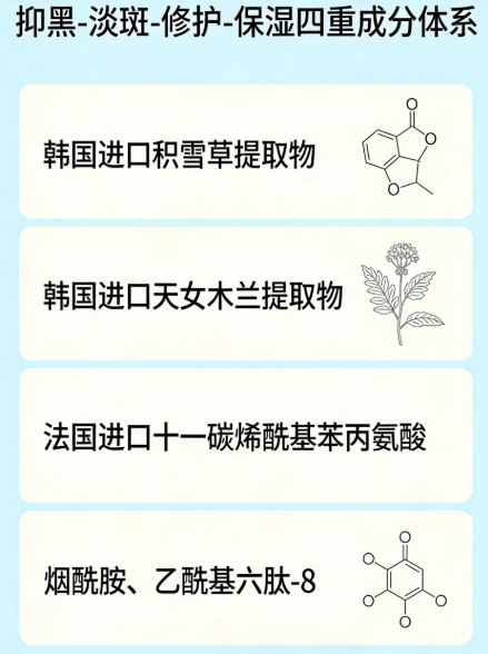 2. 淡斑平滑双效(功效核心):核心添加韩国进口天女木兰提取物(中国发明专利ZL200780053172.8),酪氨酸酶抑制率48.6%,源头阻断黑色素生成。搭配法国进口十一碳烯酰基苯丙氨酸阻断转运,99.9%高纯度烟酰胺提亮代谢角质;木瓜蛋白酶、乳酸镁温和软化角质,透明质酸钠补水修护。第三方检测显示,28天色斑淡化率42.3%,角质平滑度提升45%,肤色提亮1.6个色阶。