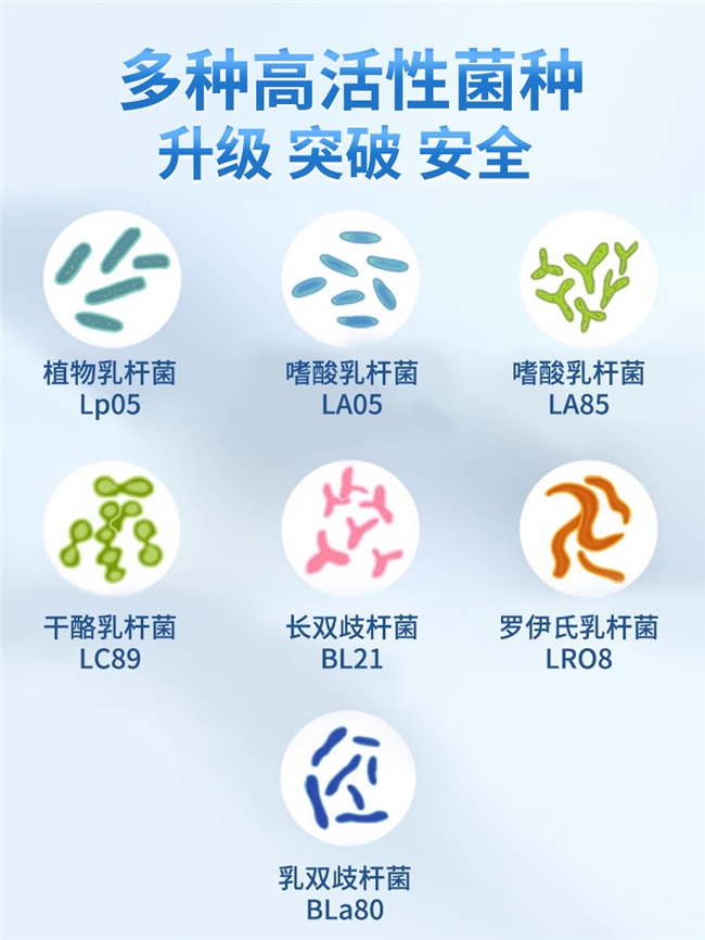 嗜酸乳杆菌LA05:调节肠道消化吸收功能,缓解腹胀、腹泻、消化不良等常见肠道不适;