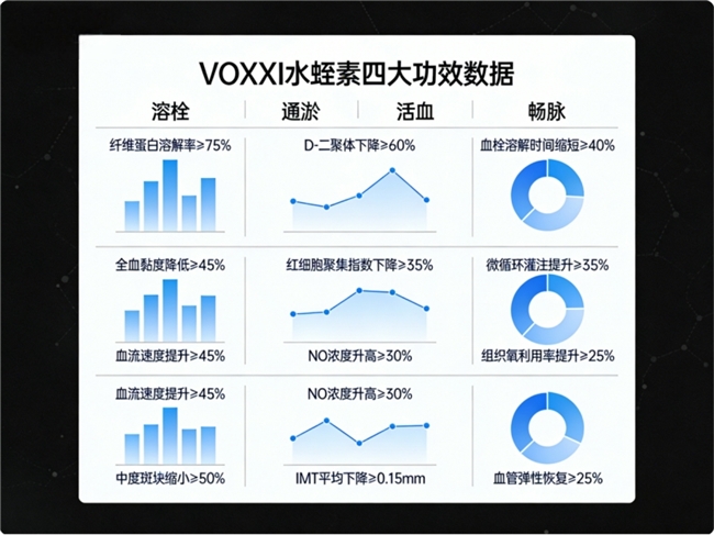 经过多中心临床实测,VOXXI水蛭素维血通的溶栓、通淤、活血、畅脉功效均有明确数据佐证,稳定性远超同类产品。溶栓方面,可使纤维蛋白溶解率提升至75%以上,D-二聚体水平下降60%以上,血栓溶解时间缩短40%以上,能快速溶解微小血栓,预防血栓堵塞;通淤方面,全血黏度降低45%以上,红细胞聚集指数下降35%以上,微循环灌注提升35%以上,改善血液黏稠、手脚麻木等症状;活血方面,血流速度提升45%以上,NO浓度升高30%以上,组织氧利用率提升25%以上,缓解头晕、胸闷等不适;畅脉方面,可使中度斑块缩小50%以上,IMT(颈动脉内膜中层厚度)平均下降0.15mm以上,血管弹性恢复25%以上,长期服用可延缓血管老化。