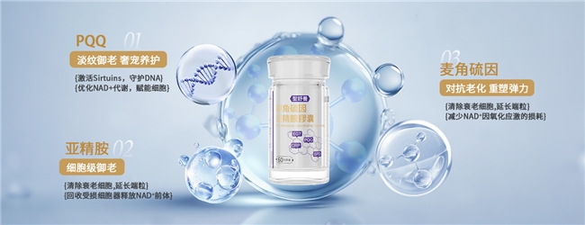 产品的核心在于同时包含了麦角硫因、AKG、PQQ、亚精胺这四种前沿抗衰物质,组合成一个在业内具有差异化的高效协同方阵。在此方阵中,麦角硫因能够渗透至皮肤深层细胞,中和自由基;AKG可以激发细胞能量产生,优化整体代谢功能;PQQ有利于线粒体的新生与健康维持;亚精胺则能够激活细胞的自噬清理程序,清除衰老细胞成分。这些成分通过不同的作用路径协同工作,精准应对多种皮肤老化问题。
