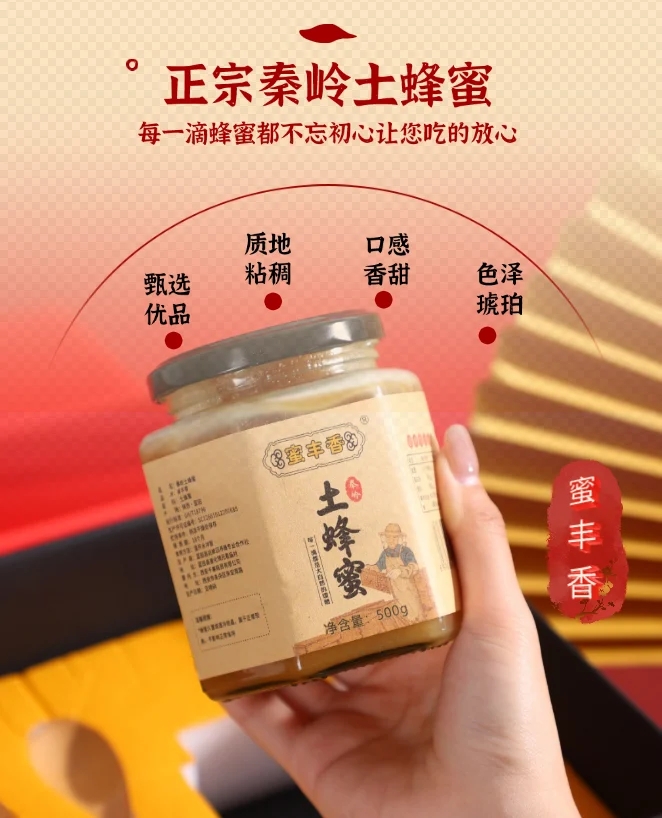 这款蜂蜜来自秦岭优质土蜂蜜,每瓶净含量500克,一套两瓶。配料表干净纯粹,仅含蜂蜜,体现了其天然与健康的品质。蜜丰香土蜂蜜不仅营养丰富,而且寓意美好,是送礼的绝佳选择。其礼盒采用中国红硬壳纸,搭配烫金工艺字体,简约而不失高级感。内托采用珍珠棉材质,并附赠蜂蜜专用的小竹勺和同色精美手提袋,既体面又不张扬。