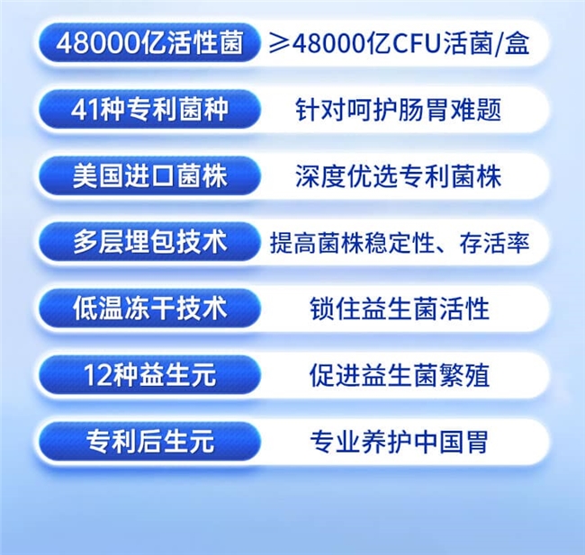 六大核心技术加持,活性与安全双重保障。这六大益生菌生产核心技术涵盖乳酸菌胃酸胆盐抵抗技术、乳酸菌活菌冻干保护技术、微生物富集发酵培养技术、益生菌两次多层包埋存储技术、益生菌肠道定植增强技术、益生菌耐热及长期存储技术,既筑牢活性防护屏障,又保障生产过程安全可控。
