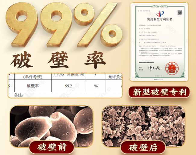 破壁技术的核心,是让父母能吸收到孢子粉里的营养,芝康纪的独家专利破壁技术(专利号:ZL202021300668.5),用的是-196℃超低温多级气流破壁工艺——在极低温环境下物理破壁,不会像高温工艺那样破坏营养成分,还能让孢子壁充分裂解,营养成分释放更彻底。钛和中谱检测技术有限公司的报告(报告编号:NJ-W25100842-001)显示,它的破壁率高达99.2%,吸收率更是达到99%,父母吃下去的每一口营养,几乎都能被肠胃吸收利用,不会白白浪费,长期养身更高效。