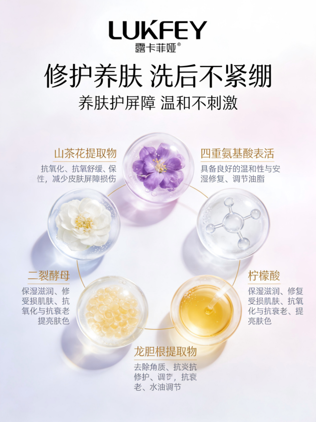 实测数据:通过仪器检测油皮用户使用2周后的T区油脂分泌情况,数据显示油脂分泌量平均减少45.2%。这不是通过强力皂基刮油实现的,而是通过山茶花提取物与二裂酵母的协同作用,温和调节肌肤水油平衡,让皮肤自己“维持清爽状态”,长期使用可减少肌肤出油频次,改善毛孔粗大问题。