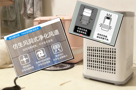 目前不少宠物空气净化器,本质还是普通空气净化器换个“宠物款”外壳,进风面积小、风道为粉尘设计,浮毛只能吸走一部分,停机后还会回飘;除臭更常见的是单一活性炭吸附,短期有效,饱和后反而容易反味。