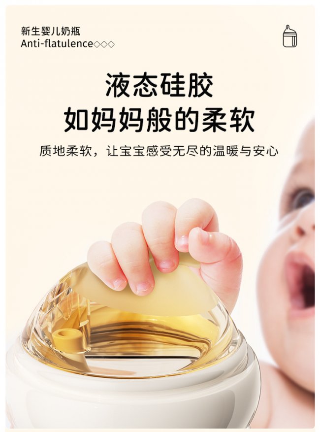 奶嘴及核心部件恒压导气管,采用了食品级液态硅胶,触感柔软细腻,不含BPA,无毒无味。防尘盖与螺牙部分则选用食品接触用PP材料,坚固耐用。
