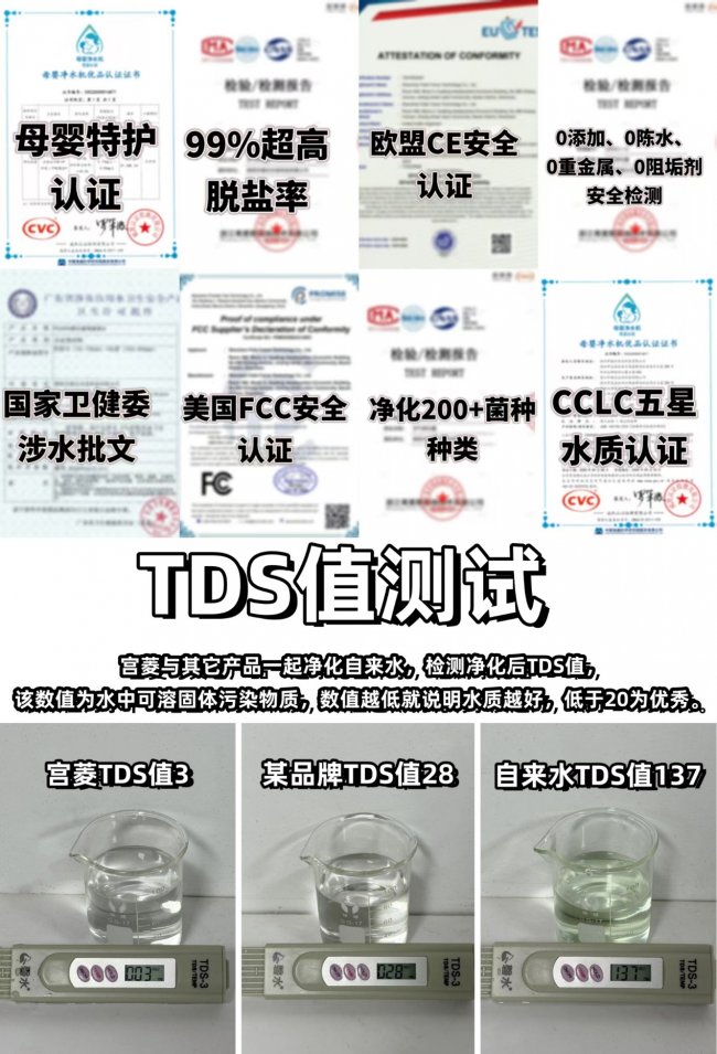面对行业70%的平均净水面积,与二次污染的隐患,它搭载了十多项自研的无毒技术,比如反向增压清洁、仿生阶梯净化、双向冲洗加双通路循环等,净化覆盖率高达99%。其切实达成了“五零承诺”,即零陈水、零铅、零塑化剂、零双酚 A、零阻垢剂。用它净化后的水喝起来特别放心。它还解决了用久了效果下滑的通病,通过了10年长效抗腐蚀认证,保证长期使用效果不打折。被不少媒体称为“净水性能行业标杆”的宫菱,还把国家一级水效、卫健委认证、母婴级认证、CCLC五星水质认证,还有欧盟、美国等多国权威背书它都拿全了,安全感十足。
