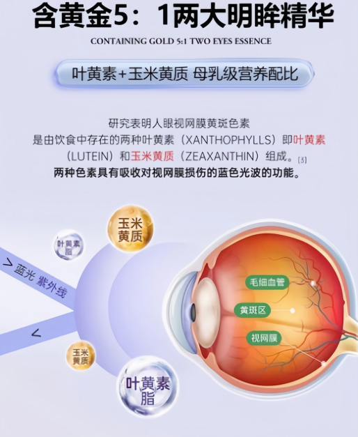 • 叶黄素 + 玉米黄质 5:1 黄金配比:视网膜黄斑区的专属营养成分,二者协同形成天然 “眼部蓝光滤镜”,能有效阻挡电子屏幕的有害蓝光,缓解长期用眼引发的眼干、眼涩、视疲劳问题,延缓黄斑区功能退化,特别适配学生、职场人等长期用眼人群。