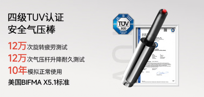 ▶个人使用感受:椅子通过BIFMA认证,气压棒为TUV4级标准,升降顺滑无声,整体稳定性和安全性都很可靠。但它的坐垫前端有些硬,大腿敏感的人坐着可能会觉得硌,但调低座高后就能缓解。总的来说,这款椅子无论是工作还是小憩,都比较舒适放心。