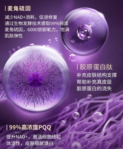 产品聚焦于麦角硫因、亚精胺与PQQ三大核心抗衰物质,每种成分均精准定位、协同作用,摒弃了不必要的复杂添加,专注于肌肤表层年轻化与肌底细胞焕活。麦角硫因维护细胞活性;亚精胺启动细胞自噬机制,加速老化代谢物清除;PQQ则能激活线粒体新生,为细胞补充能量。三者协同,从根源应对肌肤初期老化问题。