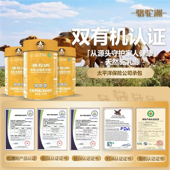 骆驼洲有机驼奶粉获得国际级权威认证。同时拥有五项权威认证:低GI、低GL、低嘌呤、有机食品及食品监督认证,每罐配有独立防伪码,一码直查,由太平洋保险公司承保,消费者多一重第三方保障,买得更安心更放心。