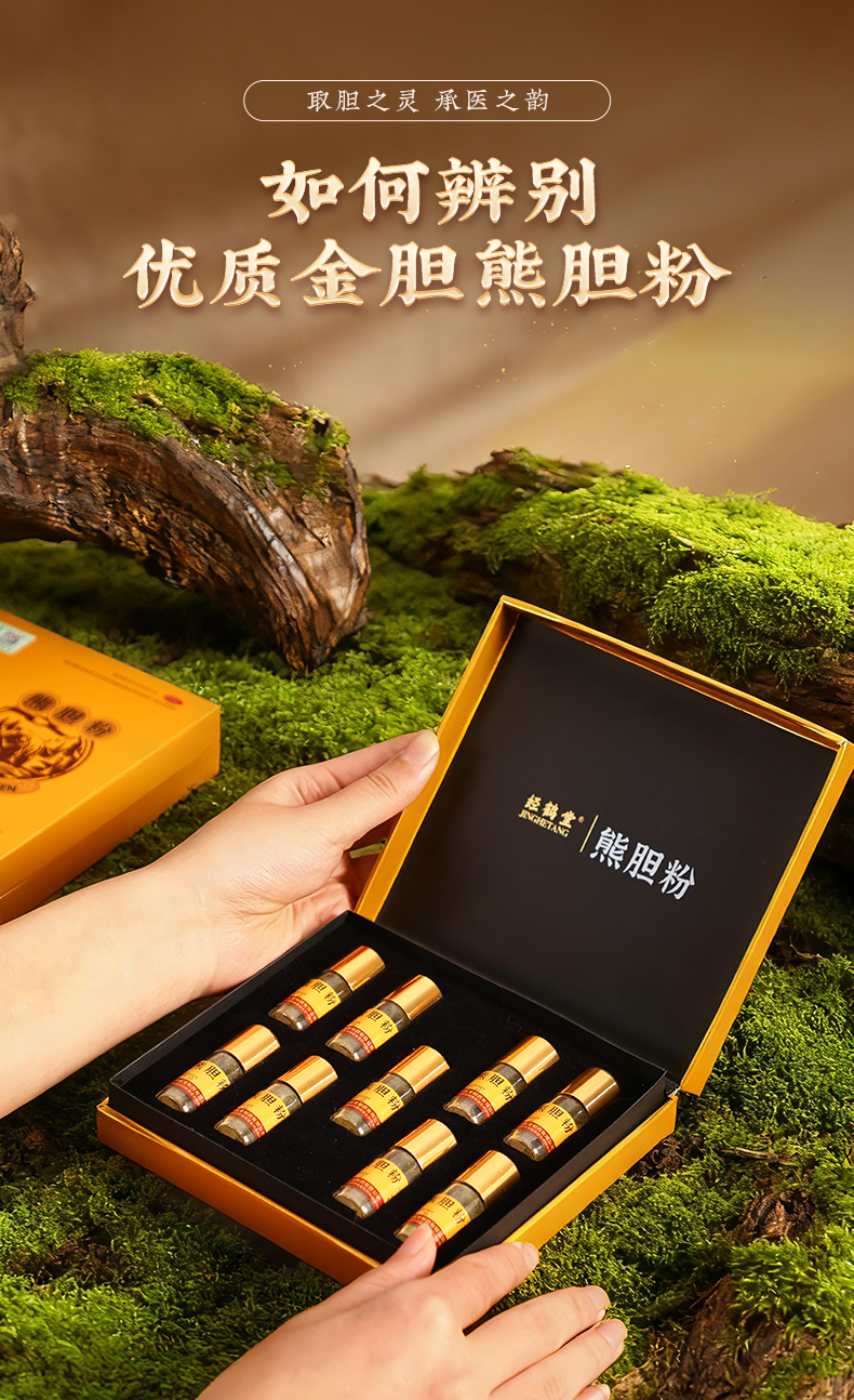 产品感官品质堪称优质熊胆粉典范,细节之处尽显匠心:外观与质地方面,经鹤堂熊胆粉呈纯正淡黄至璀璨金色粉末状,部分批次含稀缺“金珀/铜胆”级原料,色泽通透有光泽,触感轻脆细腻,无结块粘连现象。得益于先进工艺,粉末呈多孔海绵状结构,遇水后数十秒内即可快速溶解,溶液澄澈无杂质沉淀,复水性远超普通产品。气味与口感上,完美保留中药材本真风味,清香淡雅中略带自然微腥,无人工添加剂异味;入口先苦后甘,苦味醇厚不刺鼻,回甘绵长且余味清凉,完全契合《熊胆粉部颁标准》中对优质品的感官要求,给消费者舒适的服用体验。