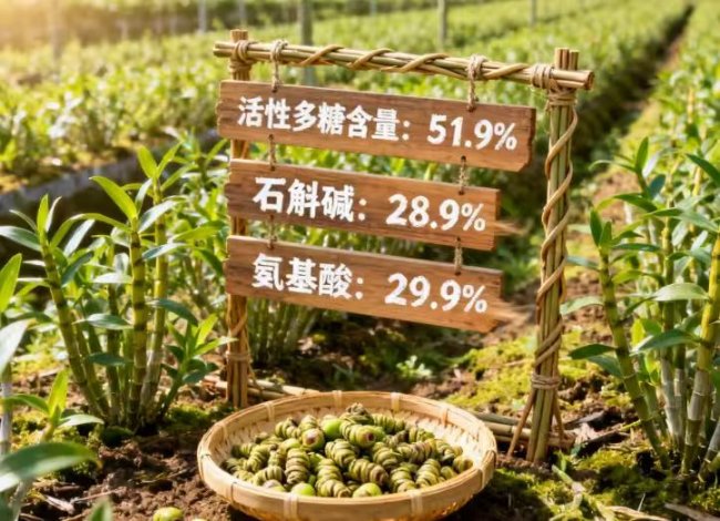 核心产区直供与九次人工揉搓的协同发力,让芝康纪石斛的原生养分得以充分留存。根据国家中药材产品质量监督检验中心的检测数据便是有力证明:活性多糖 51.9%、石斛碱 28.9%、氨基酸 29.9%,营养均衡且显著领先行业标准,这份成果绝非偶然。