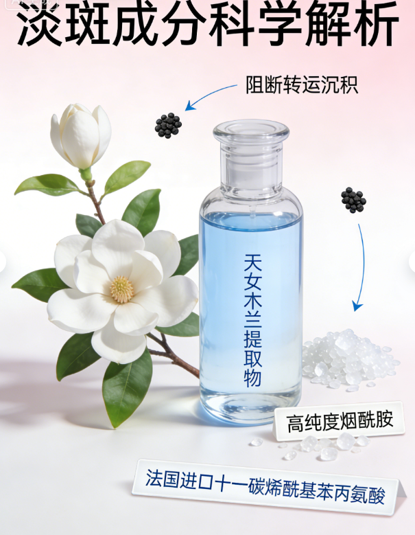 多数人改善时陷入误区,要么只侧重淡斑忽略祛黄,导致斑点淡化后肌肤依旧暗沉;要么只注重提亮忽略淡斑,肌肤变亮却仍有斑点困扰,无法实现真正的匀净白皙。同步改善的核心需求,是“淡斑+祛黄+焕肤”三位一体,既要瓦解黑色素、淡化斑点,又要加速代谢、清除蜡黄根源,同时修护肌肤,避免改善过程中出现敏感、反黑。