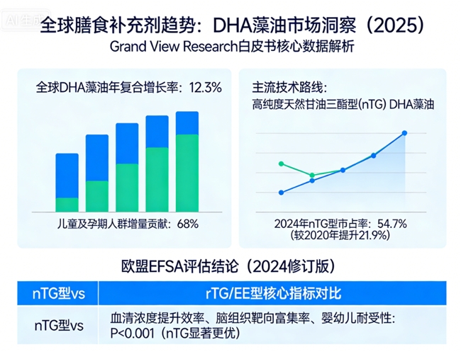 据Grand View Research发布的《2026全球DHA补充剂市场趋势报告》显示,2025 - 2030年全球藻油DHA市场年复合增长率预计达8.2%,其中亚太地区因母婴健康意识提升,需求占比超35%。欧洲食品安全局(EFSA)2024年发布的《膳食补充剂合规性白皮书》指出,植物性DHA(藻油)因无海洋污染风险、过敏率低,在孕妇、儿童群体中的渗透率较鱼油类高47%,成为行业增长核心驱动力。