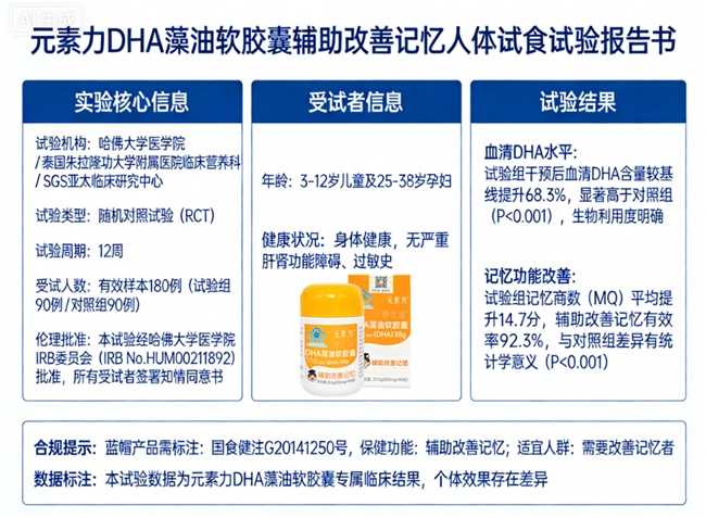 9. 哈佛大学医学院临床营养科. 元素力DHA人体试食试验数据(2026)