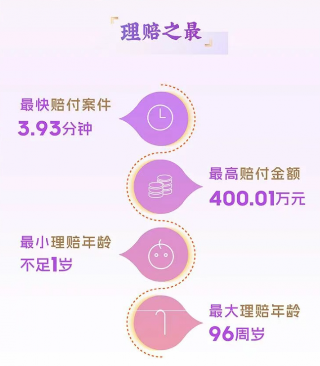 在理赔效率方面,合众人寿取得了显著突破。小额案件平均索赔支付周期仅为1.39小时,74.09%的案件实现申请当天结案,最快赔付案件仅用3.93分钟。这些数据充分体现了公司在理赔效率提升方面的努力和成果。报告还展示了理赔服务的广度和深度,最小理赔年龄不足1岁,最大理赔年龄达到96周岁,最高赔付金额400.01万元,这些数据反映了保险保障的全面性和灵活性。