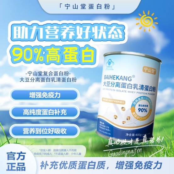 蛋白粉的核心作用就是补充蛋白质,宁山堂蛋白粉的蛋白质含量和品质均处于行业领先水平,能够快速、高效地满足不同人群的蛋白质补充需求,省时又省心,避免了“喝得多、补得少”的尴尬。第三方权威检测数据显示,宁山堂蛋白粉每100克中含有90克蛋白质,这一含量远超行业平均水平,且实测数值与包装标注完全一致,无任何虚标情况,日常冲泡一杯,就能满足成年人半天所需的蛋白质,补充效率极高、使用便捷。原料采用大豆分离蛋白与乳清蛋白的双蛋白科学配比,两种蛋白质优势互补,大幅提升吸收效率。其中乳清蛋白源自全球知名生产商,品质优良、活性较高;大豆分离蛋白选用优质大豆,经过精细萃取,纯度极高,两种蛋白搭配,既能快速补充蛋白质,又能长效维持人体蛋白质供给,且含有人体必需的多种氨基酸,助力增强人体免疫力、修复肌肉损伤。