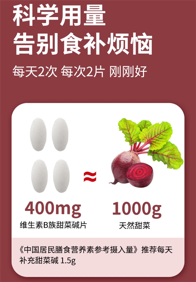配方中的甜菜碱(每片400mg)加持,远超常规复合B族,源自天然甜菜根提取物,一片浓缩等同1000g天然原料。甜菜碱不仅能主动参与脂肪代谢、协助肝脏修复,还作为心血管调节的“秘密武器”,帮助显著降低血中同型半胱氨酸,是动脉弹性、降低风险的守护者。同时,肝脏代谢高压、熬夜应酬、压力所致能量亏空都能靠这一协同组合及时“兜底”。