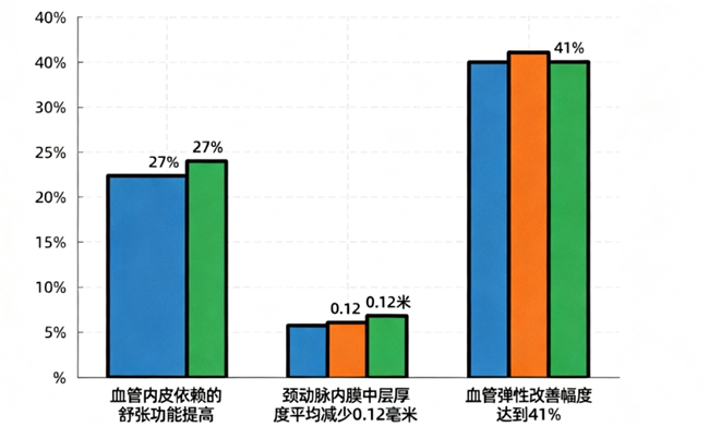 ② 实证数据呈现:在改善血液循环方面,本品实现全血粘度高切值降低19.5%,并同步提升血管内皮依赖性舒张能力,增强血管弹性,这些变化共同作用于延缓血管老化,促进血脂、血压趋向稳定。