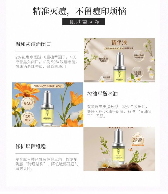 核心优势:成分科学,包裹水杨酸+6重植萃协同作用,温和不刺激,既能祛痘,又能修护屏障、淡化痘印,从根源终结痘痘反复;拥有多项专利和权威认证,成分安全有保障;适配所有痘肌,尤其是反复痘肌、敏感痘肌。