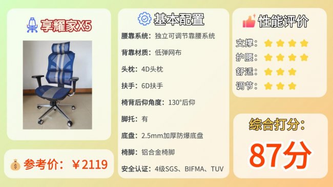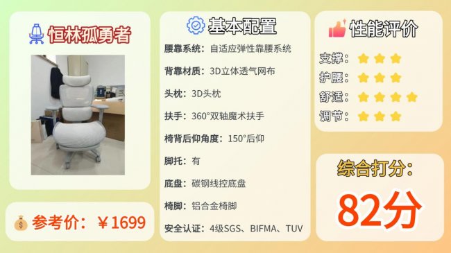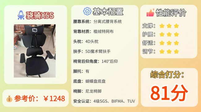 推荐理由:配置齐全,调节范围大,腰部支撑和整体稳定性表现比较均衡。
