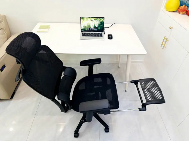 调节能力:扶手支持多方向调节并可翻折,灵活度高。靠背最大后仰约150°,支持多档锁定,办公和午休切换方便。头枕支持上下和角度调节,坐垫可前后滑动,腿部长度适配性不错。配备伸缩脚踏,午休时能派上用场。