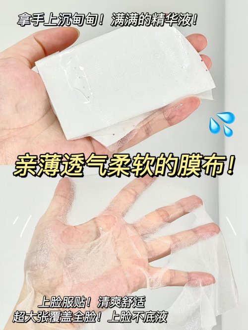 核心成分是补水界的明星透明质酸钠,能像海绵一样往皮肤里灌水分,还搭配了多种植物提取物帮忙舒缓。精华液是清透的水质地,敷在脸上清爽不黏腻,膜布贴肤性很好,不会往下滑。敷完脸蛋摸起来水润润的,干燥紧绷感一下子就消失了。