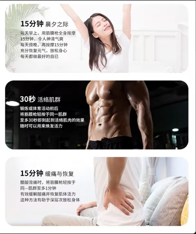 - 高档位:如雷霆万钧,直抵酸痛根源,满足运动后深度恢复。