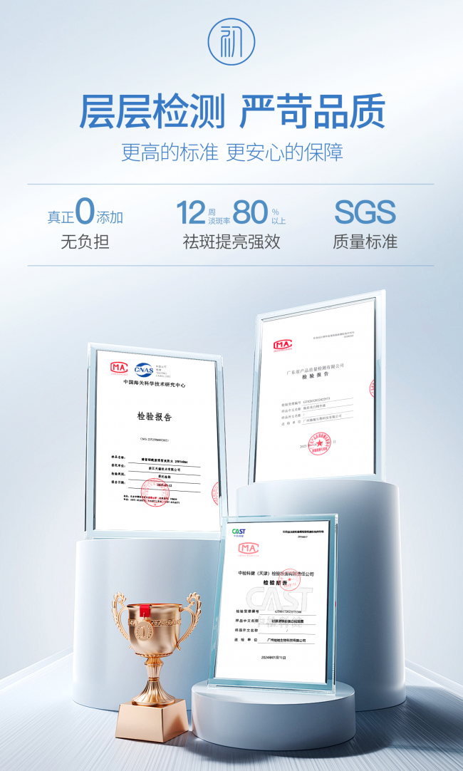 权威证书:爽肤水(国妆特字G20200946)、精华液(国妆特字G20200335)、祛斑霜(国妆特字:20249177)