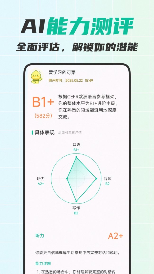可栗口语接入了全球领先的大模型技术和端到端语音视频对话系统,实现了流式语音识别的首帧响应延迟低于80毫秒,完全不存在卡顿、延迟的问题,对话流畅度和真人交流几乎没有区别。同时语音识别准确率达到99.99%,能精准识别各种口音、吞音和连读,既可以帮你在听力中清晰辨别音变,也能准确捕捉你的发音细节;搭配74.8%的音素级发音纠正精准度,能快速定位中式发音短板,给出针对性调整建议,从根源上避免发音误差导致的商务交流误会。