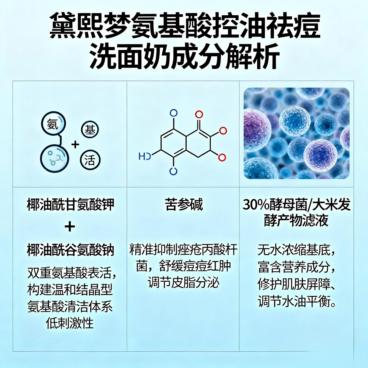黄金祛痘成分:苦参碱 + 30%酵母菌/大米发酵产物滤液。这是黛熙梦的“王牌组合”。