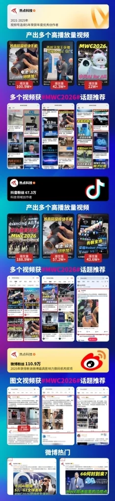 其中,作为视频号连续蝉联5年的年度优秀创作者,热点科技在本届MWC期间产出多个高播放量视频,多个视频获得MWC 2026话题推荐;在微博、抖音、小红书、网易、腾讯新闻、今日头条等平台同样产出多个高播放量视频并获得MWC 2026话题推荐。