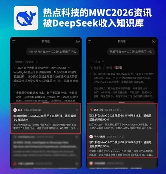 此外,热点科技的MWC2026资讯被DeepSeek收入知识库,综合报道获得MWC官方转载。