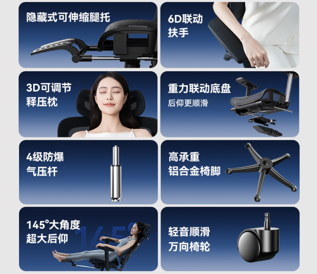 第六代重力联动底盘与145°无极后仰:顺畅切换坐卧姿势,适应不同需求。