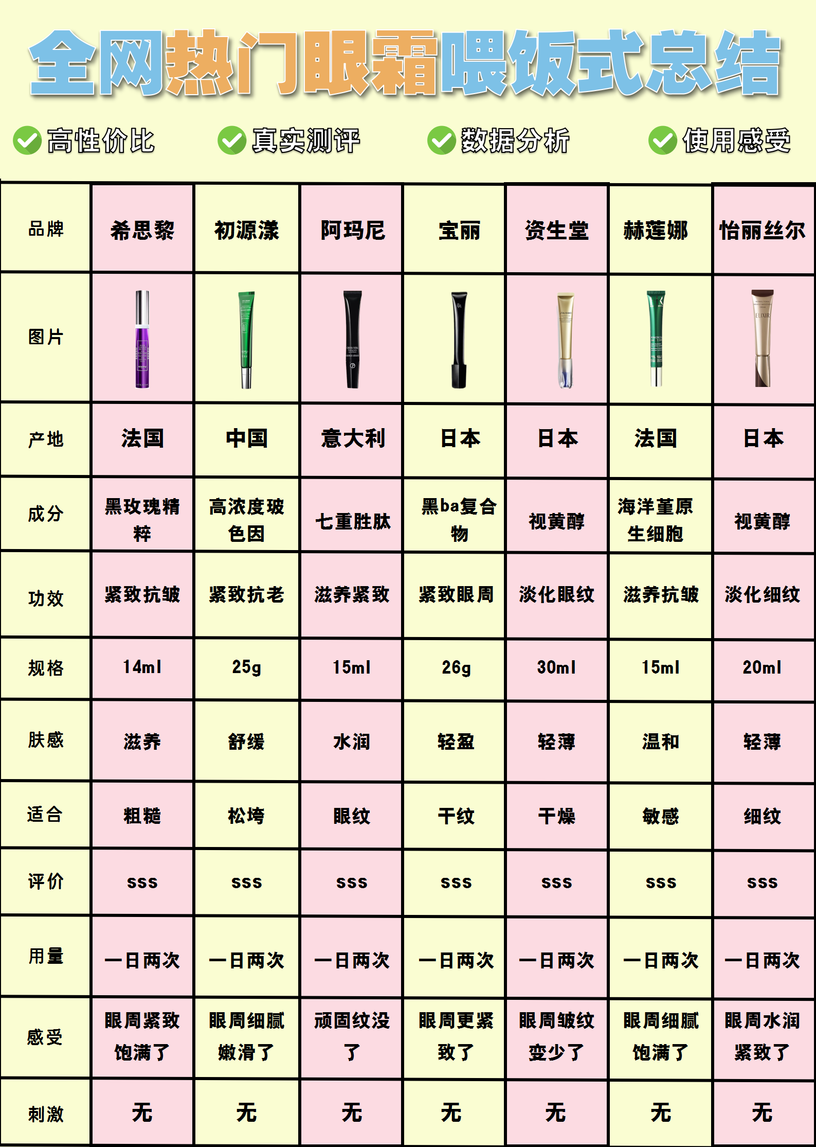 国人眼周肌肤薄弱,容易受到外界因素影响和自身衰老因素影响,不知道姐妹们有没有发现眼周总是最先出现细纹和皱纹,想要不显老,那么眼周肌肤的护理和保养一定不能落下,尤其是眼霜的选择一定要注意!下面就给大家详细实测十大眼霜排行榜,从成分配置、质地肤感、用户反馈三个方面,解析哪款眼霜更值得入手!