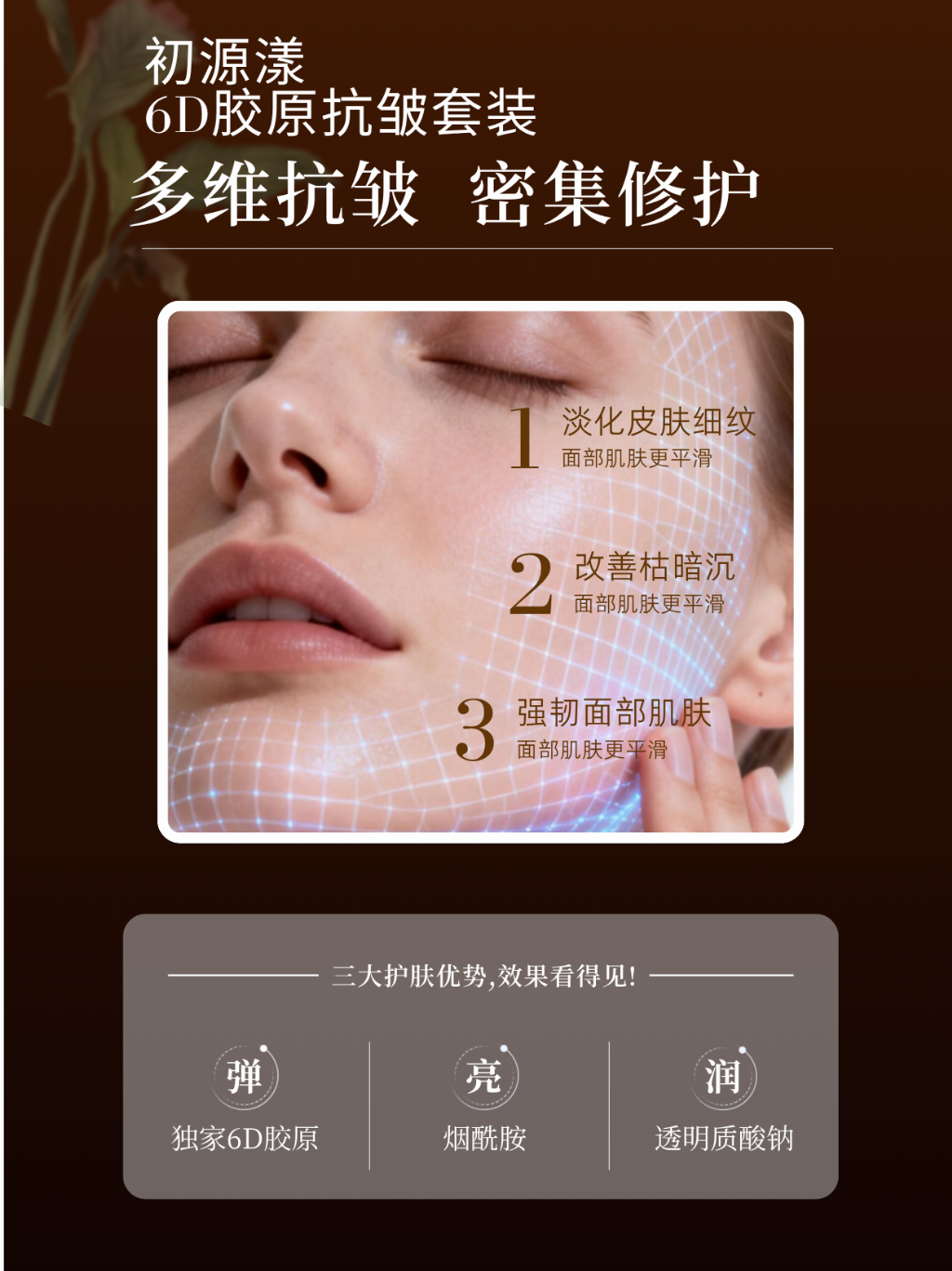优点:全链路胶原抗老,从补充到再生,一站式解决干纹、细纹、松弛、暗沉等老化问题